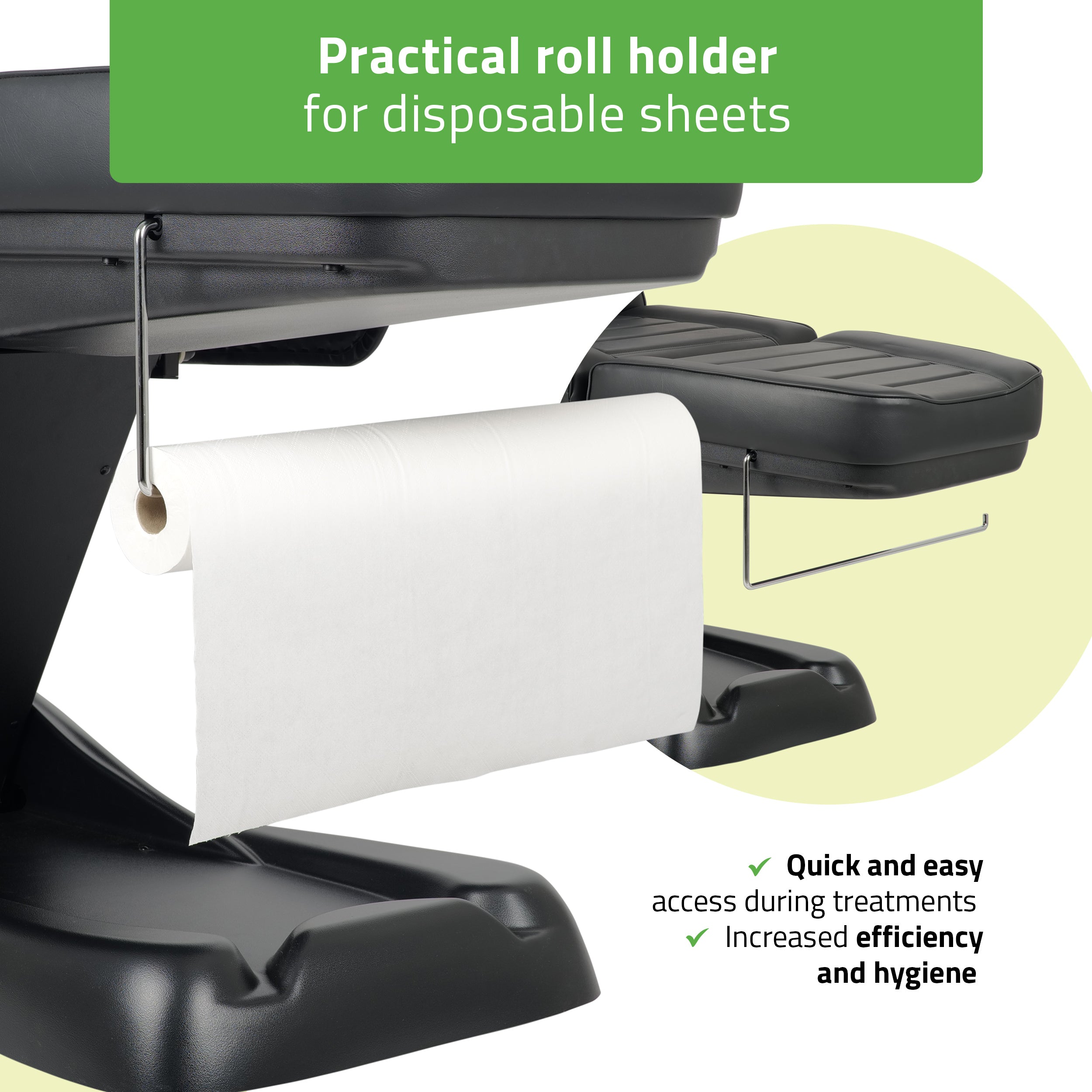 • Roll paper holder: The chair features a practical holder for disposable roll paper, increasing efficiency and hygiene during treatments.