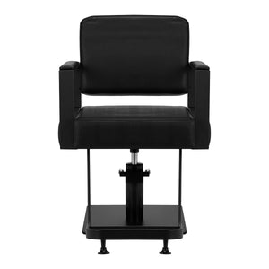 Equipping the chair with a full rotation mechanism makes the hairdresser's work more effective and comfortable. The solid, flat, square-shaped base guarantees stability during use. The matte-finished, smooth surface gives the element an elegant look and makes it easy to keep clean. A comfortable seat with foam filling ensures high comfort of use, even during many hours of treatments. Geometric, partially upholstered armrests allow for the correct positioning of the client's shoulders – this means that he does not bury his head in his shoulders or slouch – clearly making it easier to perform precise treatments, including haircuts.