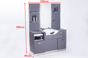 modern hairdressing console in gray with silver trim. a large mirror, sink and drawers ensure functionality, and the entire piece of furniture is finished with the highest quality. it is an elegant and at the same time universal element of the interior that will emphasize the character of any living room.