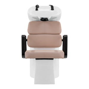 The profiled chair provides adequate lumbar support and, therefore, high comfort of use. Metal armrests in shades of black with a geometric shape allow for the correct positioning of the customer's shoulders. Filling with durable, deformation-resistant foam and upholstery made of pleasant-to-touch synthetic leather in shades of beige ensure the durability of the furniture, ease of cleaning and comfortable use for a long time. The original, elegant appearance of the hair wash unit gives the interior a unique expression. The set includes complete fittings in shades of black, including a faucet, a shower head and dedicated hoses to provide a complete set of tools for work.