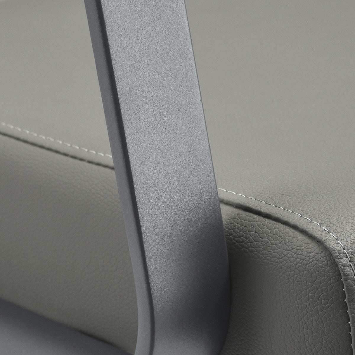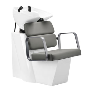 The profiled chair provides adequate lumbar support and, therefore, high comfort of use. Metal armrests in shades of gry with a geometric shape allow for the correct positioning of the customer's shoulders. Filling with durable, deformation-resistant foam and upholstery made of pleasant-to-touch synthetic leather in shades of gray ensure the durability of the furniture, ease of cleaning and comfortable use for a long time. The original, elegant appearance of the hair wash unit gives the interior a unique expression. The set includes complete fittings in shades of black, including a faucet, a shower head and dedicated hoses to provide a complete set of tools for work.