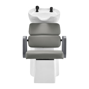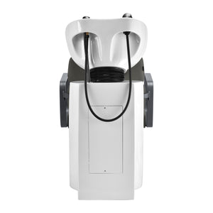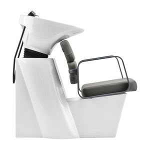 The practical hair wash unit is equipped with a mixer faucet, which provides easy access to hot and cold water. This makes it easier to adjust the temperature to the customer's individual preferences. A dedicated place to hang up the handset makes work easier, and the chrome-plated plug with a special strainer allows you to control the water flow and maintain high hygiene standards in the salon. The water connection has been placed inside the base, allowing the pipes to be easily hidden. A significant advantage of this model is the opening left between the backrest and the seat, which makes it easier to keep the living room clean by allowing you to easily sweep dirt from every nook and cranny of the chair. The hair wash unit has been designed in such a way as to ensure comfort during various treatments, ensuring proper back support. The combination of functionality and amenities makes working in a hairdressing salon even more comfortable.