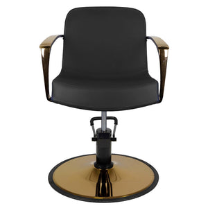 a modern hairdressing chair with a unique design and extraordinary quality. metal elements sparkle with a gold color, enhancing the sense of luxury. very comfortable, ideally suited to modern salons. specially contoured to provide the client with a comfortable position during the treatment. adjustable in the vertical plane. very stable and solid. upholstery made of high-quality eco-leather. black color.