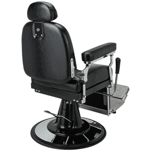 A classic barber chair with glossy black upholstery, featuring a button-tufted backrest and legrest. The adjustable headrest and reclining function ensure maximum comfort at work. Black upholstery