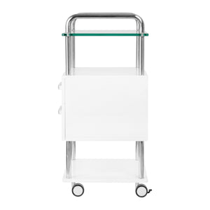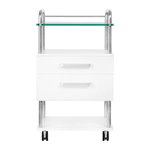 A high-quality podiatry helper is a functional cosmetic piece of furniture on wheels. Thanks to your mobility, you can transport it to other treatment rooms. The assistant has a glass worktop, two drawers for tools, accessories and a shelf for a podiatry milling machine or other device.