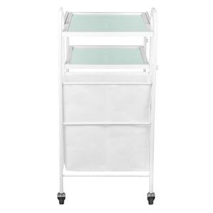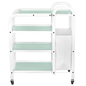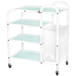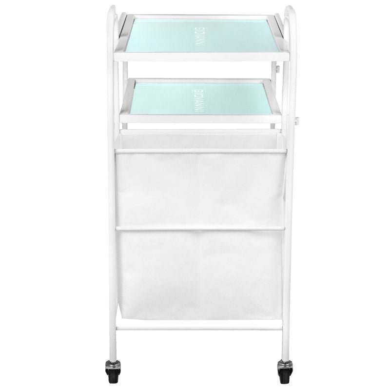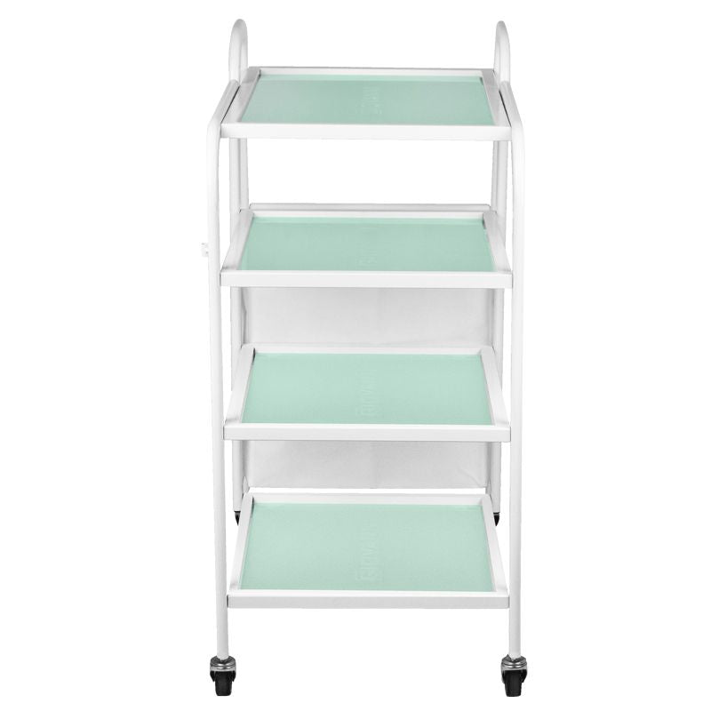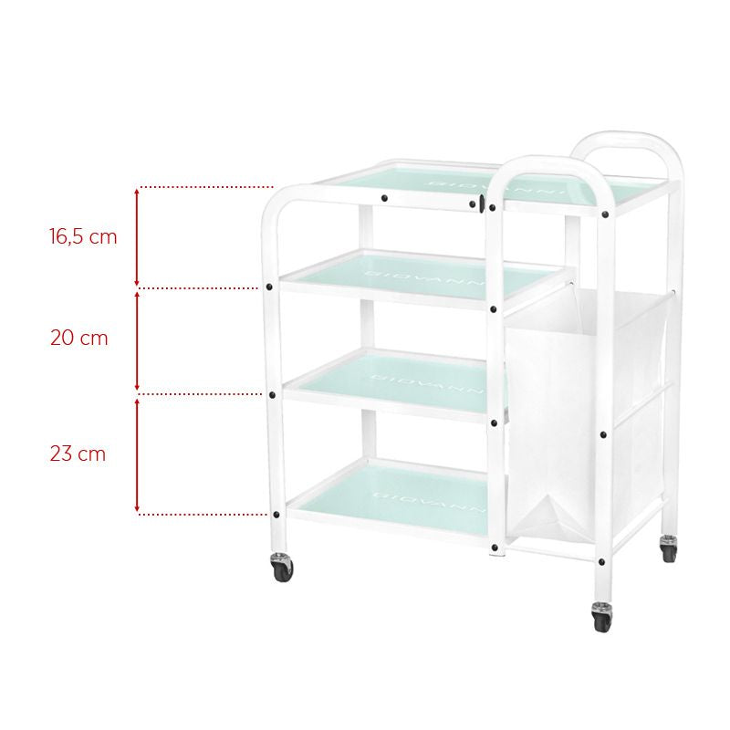 functional metal and glass table on rubber wheels. the table has four glass shelves with an engraved giovanni logo. an additional advantage of the table is a bag for dirty towels and cosmetic bands attached to it.