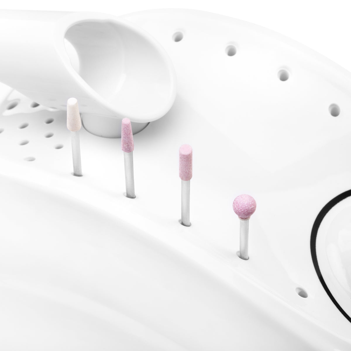 The handpiece of this nail drill machine is really solid and reaches a maximum of 35,000 revolutions per minute. You can control it via the box as well as via the attached foot drive. Reverse rotation of the handpiece with one button, no stopping necessary. You can put the handpiece onto the holder that will be attached to the control box. The special construction of the box allows you to insert bits into the holes so that they are available at hand.