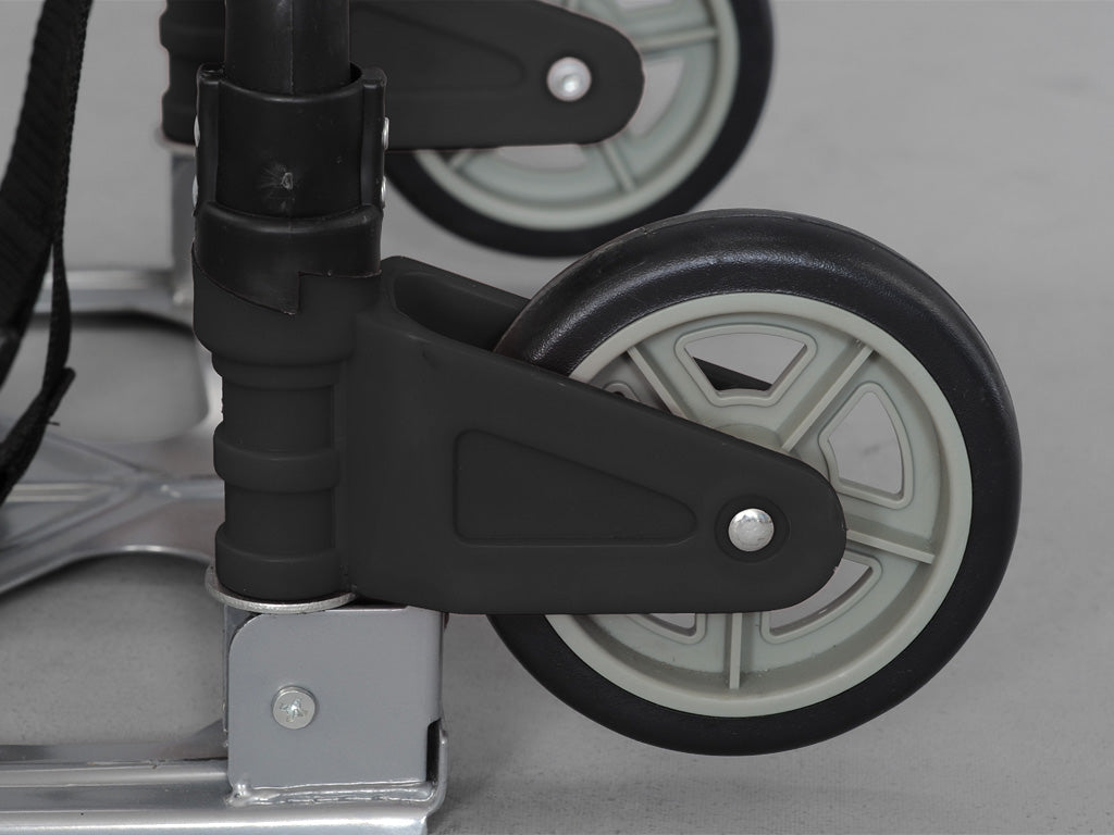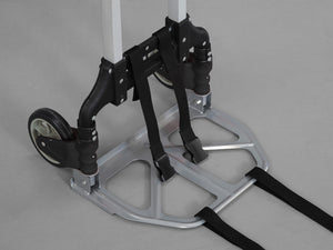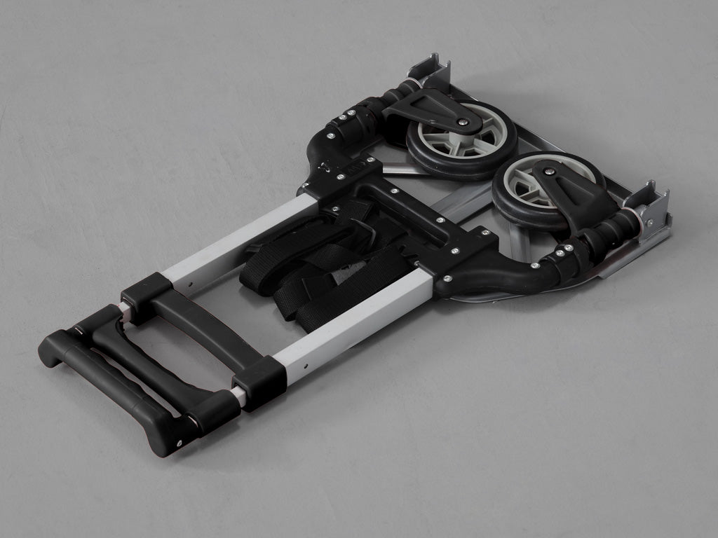 Universal, foldable, sturdy trolley for transporting folding massage tables. The large diameter wheels handle uneven terrain perfectly.