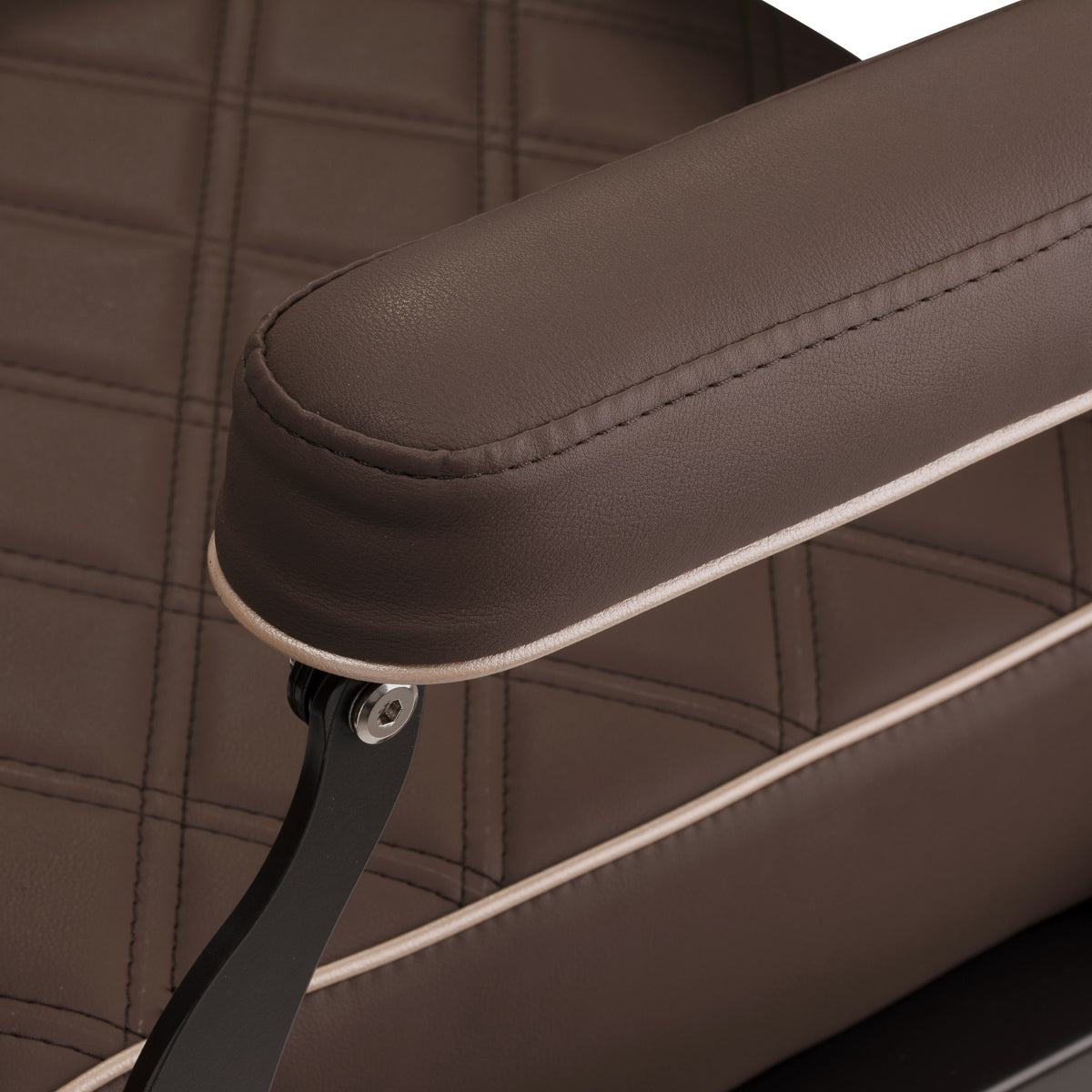 Robustní konstrukce zajišťuje stabilitu a vysoký komfort. Sedák vyplněný pěnou odolnou proti deformaci a čalounění z měkké matné syntetické kůže poskytují nábytku odolnost a pohodlí. Materiály odolné proti vlhkosti jsou nejen trvanlivé, ale také se snadno čistí. Hnědý odstín čalounění dodává křeslu jedinečný charakter a jeho elegantní styl dokonale ladí s interiérem každého holičství.