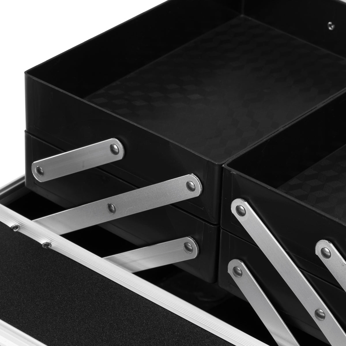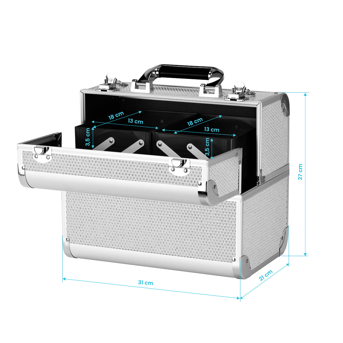 Moderní design ve stříbrných tónech s třpytivými akcenty dodává elegantní nádech. Díky rukojeti se snadno přenáší, což je důležité zejména pro mobilní stylisty. Vyrobeno z robustních materiálů odolných proti poškození pro každodenní pohodlí. Pevný uzávěr na patentku s klíčem zajišťuje ochranu obsahu a lehká, odolná konstrukce usnadňuje přenášení kufru.