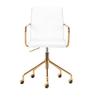 Nadotek příjemné čalounění ze syntetické kůže v odstínech bílé barvy dodává nábytku jedinečný charakter. Elegantní povrchová úprava z něj dělá opravdovou atrakci pro oči. Rám ve zlaté barvě dodává eleganci a dokonale ladí s jednoduchými tvary. Funkční kolečka zajišťují značnou mobilitu, takže je snadné křeslo přemisťovat a pohybovat se po obývacím pokoji při práci. Díky estetickému zpracování, pohodlnému používání a ergonomicky profilovanému opěradlu židle splňuje požadavky i těch nejnáročnějších uživatelů.