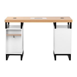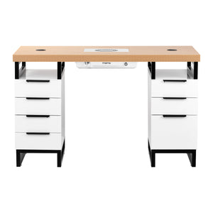 Stůl je vybaven dvěma funkčními skříňkami s objemnými zásuvkami - na levé straně jsou čtyři a na pravé dvě a jedna větší, ideální pro velké příslušenství nebo spotřebiče. Toto uspořádání usnadňuje udržování pořádku a rychlý přístup k potřebným nástrojům. Otevřené police nad zásuvkami jsou ideální pro uložení spotřebičů nebo nejčastěji používaného náčiní. Speciální kabelové průchodky a otvory umožňují estetické vedení kabelů, což zvyšuje pohodlí při práci a udržuje pořádek na stole. Na zadní straně stolu je k dispozici praktický věšák a malá polička.