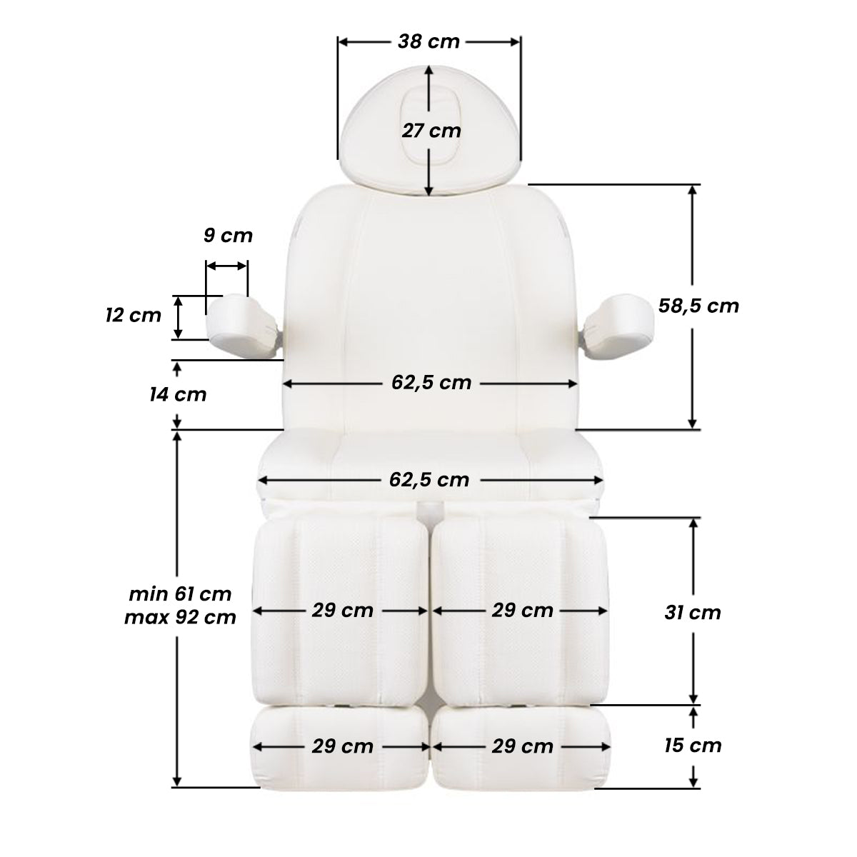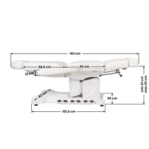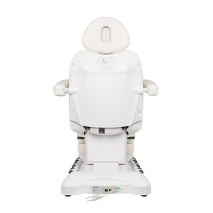 Výjimečné elektrické kosmetické křeslo ideální pro kosmetické salony a SPA. Díky nezávislým pohonům umožňuje nastavení křesla ve 3 rovinách roviny pomocí dálkového ovládání a nožních spínačů. poskytuje možnost pohodlného provádění pedikúry, ošetření obličeje a těla. Pomocí dálkového ovládání můžeme využít předprogramovaná nastavení a aktivovat funkci HOT, tj. vyhřívání. Křeslo je vybaveno perforovaným čalouněním, které u jiných křesel nenajdeme, a barevným LED osvětlením základny.