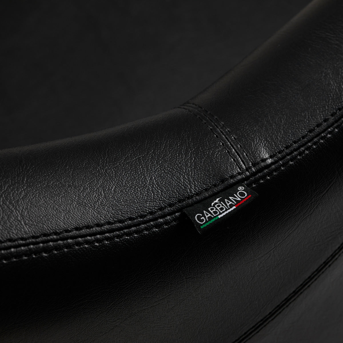 Křeslo je vyplněno pěnou, která je odolná a nedeformuje se, což zajišťuje pohodlné používání po dlouhou dobu. Čalounění je vyrobeno z na dotek příjemné imitace kůže se specifickou strukturou. Díky použití takového materiálu je zařízení odolné vůči vlhkosti, trvanlivé a snadno se čistí. Potah v odstínech černé a ozdobné kovové plochy lakované zlatou barvou mu dodávají výraz nadčasové elegance. Díky svému výraznému klasickému provedení bude vypadat skvěle téměř v každém prostoru.