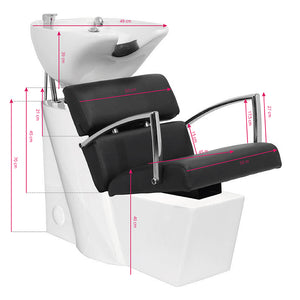 Profesionální kadeřnická podložka - stabilní, velmi pohodlná, pevně vyrobená. Díky svému modernímu designu krásně doplňuje vybavení moderního kadeřnického salonu. Sedák je vyroben z kvalitní černé ekokůže. Silikonová podložka pod hlavu stabilizuje hlavu klienta a umožňuje mu pohodlně sedět na myčce. Miska myčky v bílé barvě s možností nastavení jejího sklonu. Podložka v černé barvě