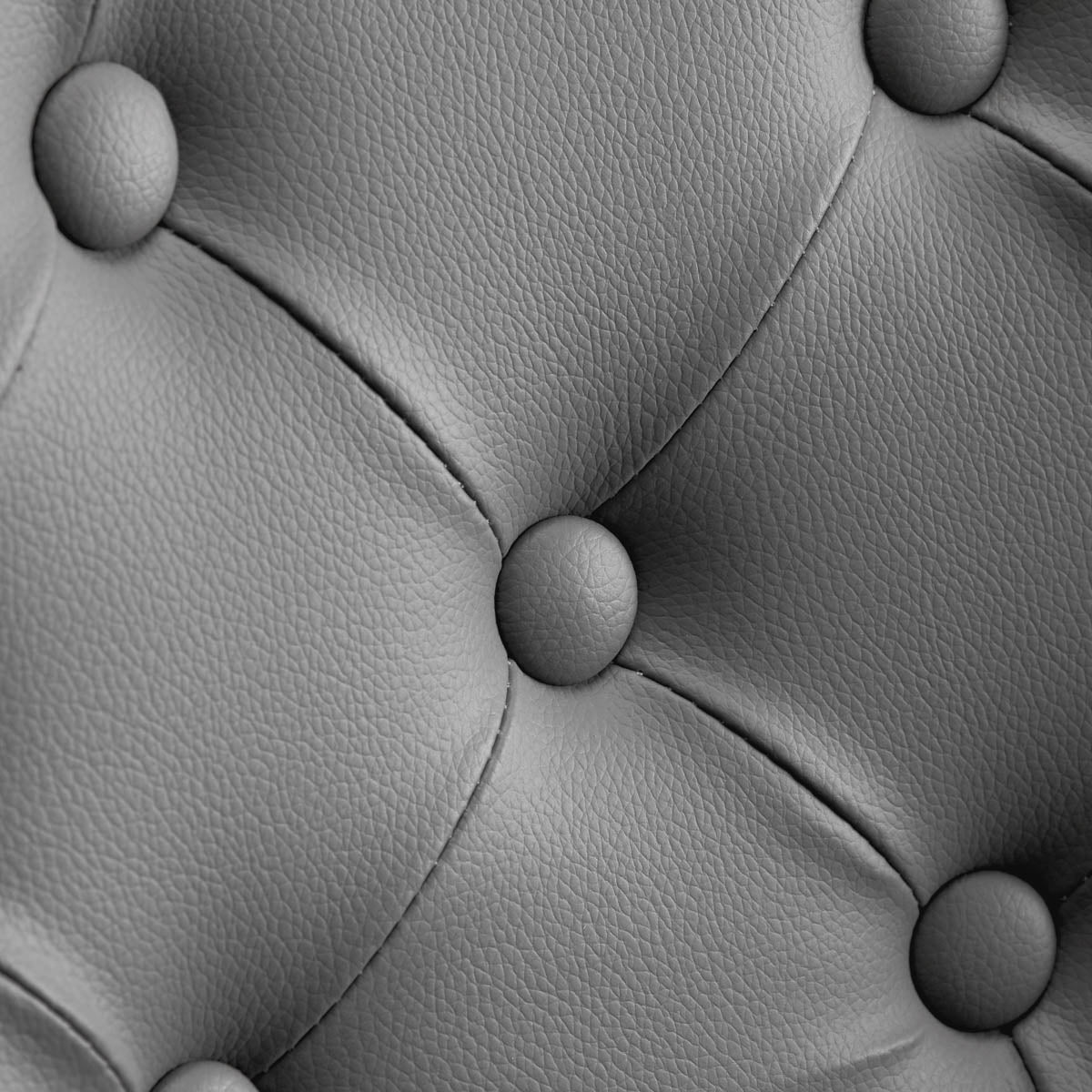 Křeslo je vyplněno pěnou, která je odolná a nedeformuje se, což zajišťuje pohodlné používání po dlouhou dobu. Čalounění je vyrobeno z na dotek příjemné imitace kůže se specifickou strukturou. Díky použití takového materiálu je zařízení odolné proti vlhkosti, trvanlivé a snadno se čistí. Potah v odstínech šedé barvy a ozdobné kovové plochy lakované zlatou barvou mu dodávají výraz nadčasové elegance. Vyznačuje se vkusnou povrchovou úpravou, která mu dodává exkluzivní charakter a předurčuje jej k použití v mnoha profesionálních salonech.