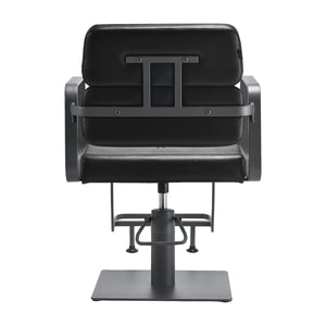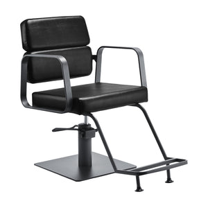 Mechanismus plného otáčení, kterým je křeslo vybaveno, zefektivňuje a zpříjemňuje práci kadeřníka. Pevná plochá základna čtvercového tvaru zaručuje stabilitu při používání. Matný hladký povrch dodává židli elegantní vzhled a díky němu se tato snadno udržuje v čistotě. Pohodlné sedadlo s pěnovou výplní zajišťuje vysokou úroveň komfortu i při dlouhém používání. Geometrické kovové područky ve zlatých tónech umožňují správnou polohu ramen klienta - díky tomu nezaboří hlavu do paží ani se nepřehrbí - a znatelně tak usnadňují precizní ošetření, včetně stříhání vlasů. Stylová opěrka nohou určená pro tento model poskytuje stabilní oporu pro nohy uživatele.