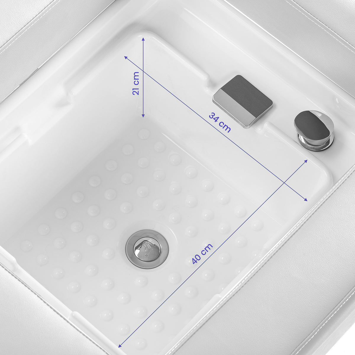 Mycí jednotka je vybavena směšovací baterií, která umožňuje snadné nastavení teploty podle přání zákazníka. Praktické místo pro sprchovou hlavici usnadňuje práci, zatímco zátka se speciálním sítkem umožňuje regulaci průtoku vody a udržení vysokých hygienických standardů v salonu. Přípojka vody je umístěna uvnitř pod mísou a vzadu pod sprchovou vaničkou, což esteticky skrývá instalaci. Ergonomicky tvarované lehátko poskytuje pohodlí a dostatečnou oporu při ošetření a přiložený puf zvyšuje komfort personálu. Kombinace funkčnosti a pohodlí činí z této mycí stanice univerzální zařízení pro kadeřnické salony i SPA salony.