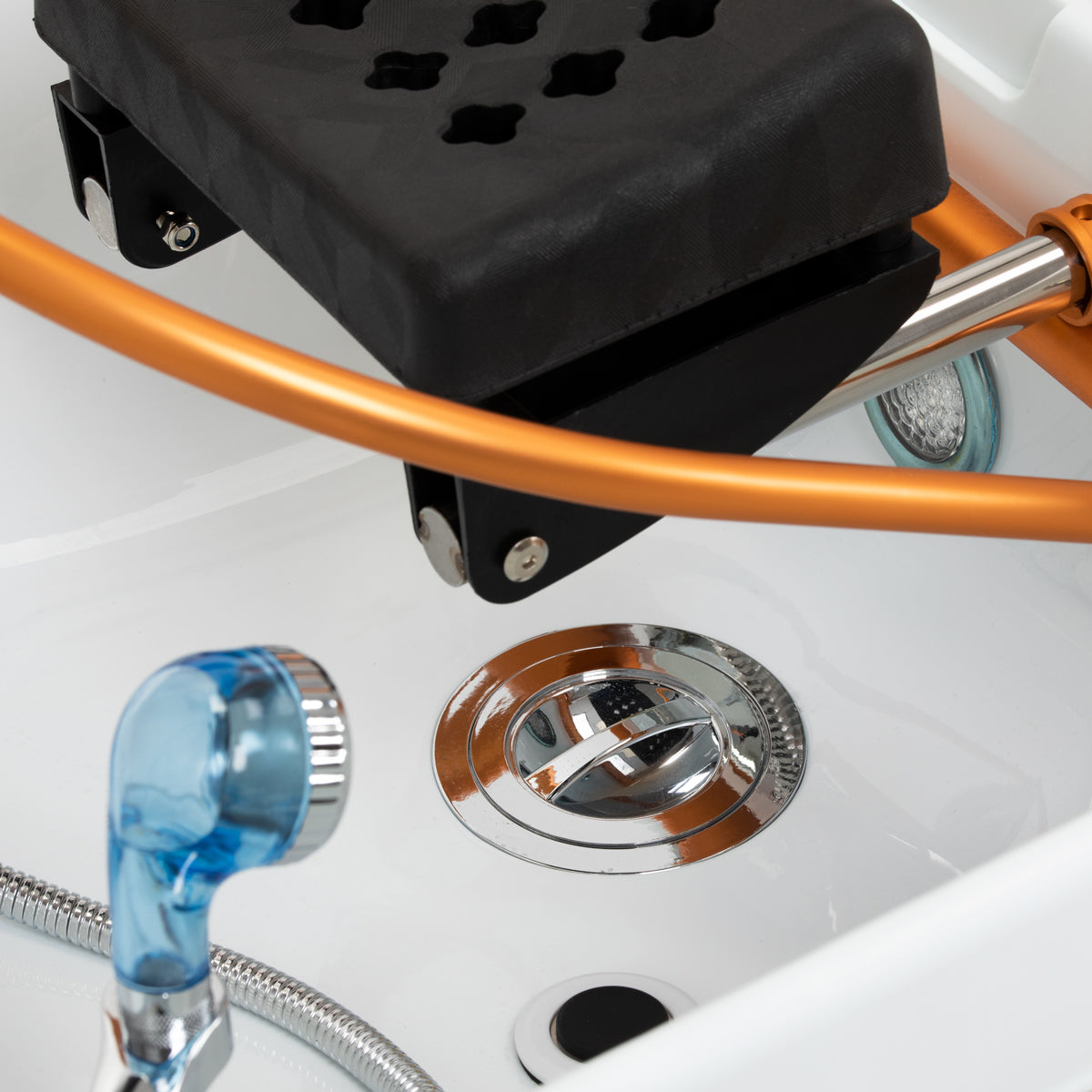 The golden arch with an adjustable inclination angle, designed for the Waterfall Head SPA, is an innovative solution that enables comprehensive scalp care. Water jets act as a natural massage, improving blood circulation, reducing tension and stress, and bringing relief from ailments such as headaches and neck stiffness. Precisely controlled water flow promotes hair regeneration and intensely moisturises the skin. Thanks to an intelligent closed-loop system, the arch draws water from the basin and reuses it, providing a continuous water massage. A combination of technology and relaxation that supports hair health and well-being.