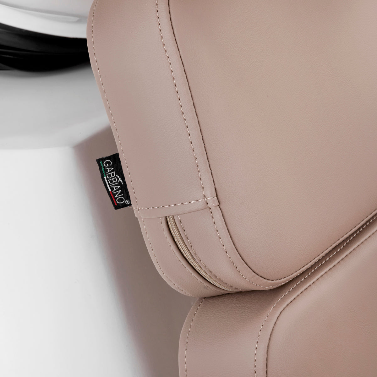 Profilované křeslo poskytuje správnou bederní oporu, a tím i vysoký komfort používání. Kovové područky v odstínech zlaté barvy s geometrickým tvarem umožňují správné polohování ramen klienta. Polstrování z odolné pěny odolné proti deformaci a čalounění z na dotek příjemné syntetické kůže v béžových odstínech zajišťují odolnost nábytku, snadné čištění a pohodlné používání po dlouhou dobu. Originální, elegantní design myčky dodává interiéru jedinečný výraz. Součástí balení je kompletní příslušenství v odstínech černé barvy, včetně baterie, sprchové hlavice a vyhrazených hadic, které vám poskytnou kompletní sadu nástrojů pro vaši práci.