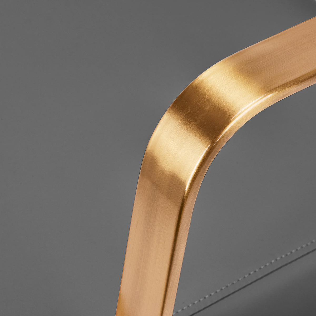 Mechanismus plného otáčení, kterým je křeslo vybaveno, zefektivňuje a zpříjemňuje práci kadeřníka. Pevná plochá základna čtvercového tvaru zaručuje stabilitu při používání. Matný hladký povrch dodává židli elegantní vzhled a díky němu se tato snadno udržuje v čistotě. Pohodlné sedadlo s pěnovou výplní zajišťuje vysokou úroveň komfortu i při dlouhém používání. Geometrické kovové područky ve zlatých tónech umožňují správnou polohu ramen klienta - díky tomu nezaboří hlavu do paží ani se nepřehrbí - a znatelně tak usnadňují precizní ošetření, včetně stříhání vlasů. Stylová opěrka nohou určená pro tento model poskytuje stabilní oporu pro nohy uživatele.