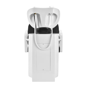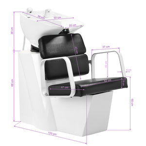 Profilované křeslo poskytuje správnou bederní oporu, a tím i vysoký komfort používání. Kovové područky v odstínech bílé barvy s geometrickým tvarem umožňují správné polohování ramen klienta. Výplň z odolné pěny odolné proti deformaci a čalounění z na dotek příjemné syntetické kůže v odstínech černé zajišťují odolnost nábytku, snadné čištění a pohodlné používání po dlouhou dobu. Originální, elegantní design myčky dodává interiérům jedinečný nádech. Součástí balení je kompletní příslušenství v odstínech bílé barvy, včetně baterie, sprchové hlavice a vyhrazených hadic, které vám poskytnou kompletní sadu nástrojů pro vaši práci.