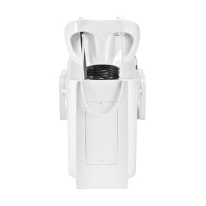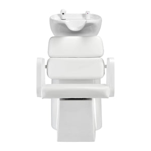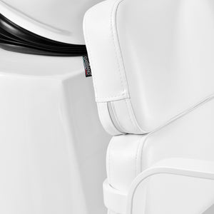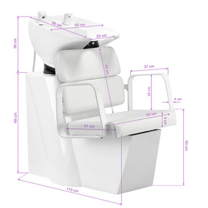 Profilované křeslo poskytuje správnou bederní oporu, a tím i vysoký komfort používání. Kovové područky v odstínech bílé barvy s geometrickým tvarem umožňují správné polohování ramen klienta. Výplň z odolné pěny odolné proti deformaci a čalounění z na dotek příjemné syntetické kůže v odstínech bílé zajišťují odolnost nábytku, snadné čištění a pohodlné používání po dlouhou dobu. Originální, elegantní design myčky dodává interiérům jedinečný nádech. Součástí balení je kompletní příslušenství v odstínech bílé barvy, včetně baterie, sprchové hlavice a vyhrazených hadic, které vám poskytnou kompletní sadu nástrojů pro vaši práci.