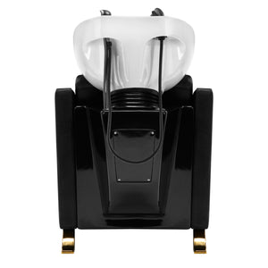 The contoured chair filled with durable foam provides adequate lumbar support and, therefore, high comfort of use. Armrests with elements in shades of gold allow for the correct positioning of the customer's shoulders. The pleasant-to-the-touch synthetic leather cover in shades of black ensures long-term durability and ease of cleaning. The elegant appearance of the hair wash unit gives the interior a unique expression. The legs and lever in shades of gold add stability and subtly emphasize the stylish character of the hair wash unit. The set includes complete fittings in shades of black, including a faucet, a shower handset and dedicated hoses to provide a complete set of tools for hairdresser’s work.