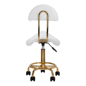Comfortable, stable cosmetic stool with a backrest, with a profiled seat, gold-colored metal elements. On a five-star base with plastic wheels. Available in white, a necessary piece of furniture in a beauty salon. Lacquered metal surfaces.