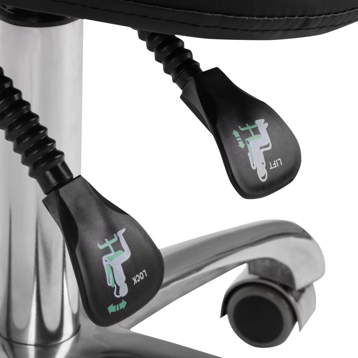 Pohodlná, exkluzivní, stabilní kosmetická stolička s opěradlem a profilovaným sedákem, na pětihvězdičkové, velmi stabilní základně. Nastavitelná ve třech režimech: