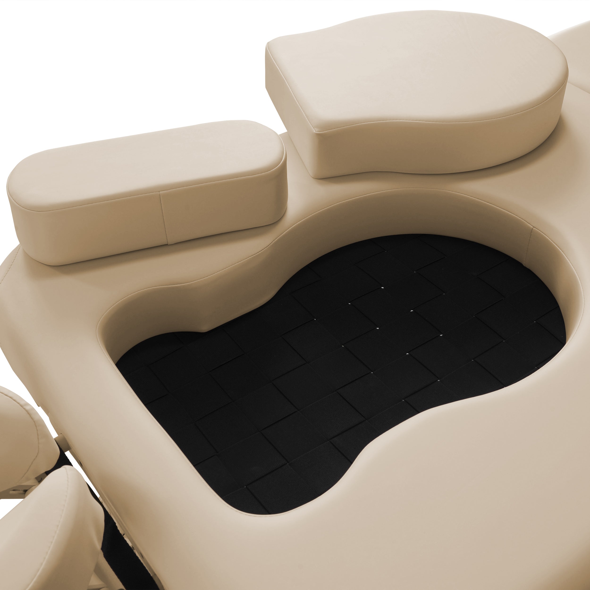 two-part, ergonomic cutout in the table for the abdomen and breasts