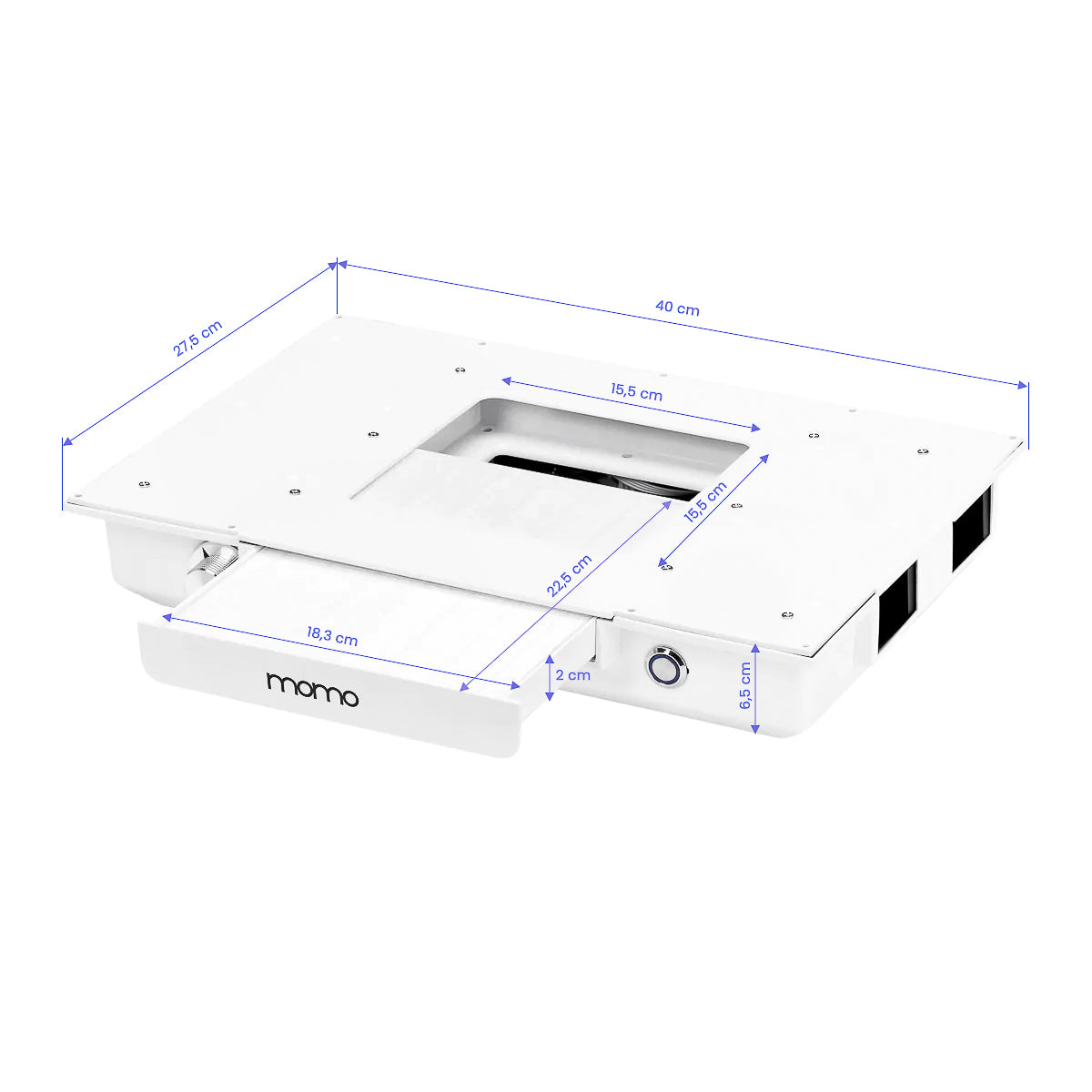 Kazetový pohlcovač prachu Momo J-02 zabudovaný v desce výrazně zvyšuje komfort a hygienu, protože účinně odstraňuje prach vznikající při kosmetických procedurách, jako je například manikúra. Díky tomuto zařízení zůstává vzduch v salonu čistý a pracovní plocha neznečištěná, což zvyšuje bezpečnost kosmetičky i klientů. Pohlcovač prachu se snadno používá a udržuje, což dále zvyšuje jeho funkčnost. Pravidelné čištění a výměna filtru zajišťují trvale vysokou účinnost pohlcování. Další náhradní filtry lze dokoupit (SKU 123581).