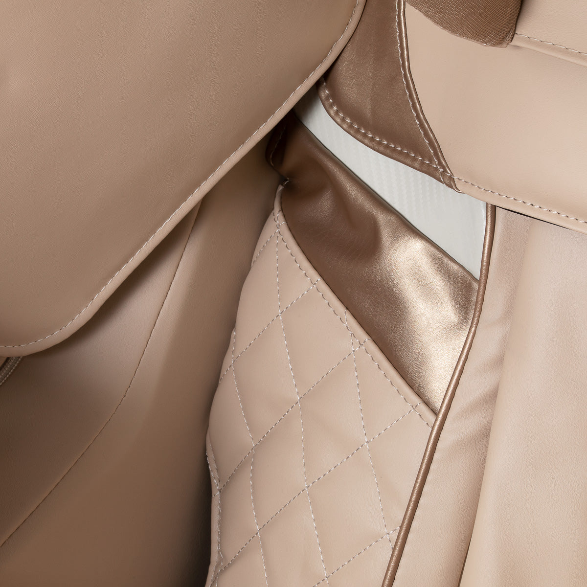 Měkká imitace kůže v béžových odstínech poskytuje výjimečné pohodlí a snadné čištění. Materiál je nejen estetický, ale je také odolný proti vlhkosti, což přispívá k jeho funkčnosti. Vnější prvky v barvě růžového zlata v kombinaci se strukturovaným povrchem v tónech bílé dodávají křeslu moderní, stylový vzhled. Díky kompaktním tvarům a tlumenému barevnému provedení model harmonicky zapadne do různých interiérů. Sakura Prime 108 je vynikající volbou pro ty, kteří hledají každodenní relaxaci - zejména po intenzivním dni nebo náročném fyzickém výkonu.