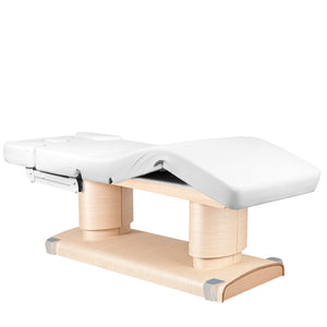 Elektrické kosmetické lehátko s nastavitelnou výškou ve velmi širokém rozsahu od 64 do 82 cm. Opěradlo, opěrky nohou rovněž nastavitelné dálkovým ovládáním. v opěradle je otvor pro obličej a podpěrné sloupky jsou ovládány nezávisle. Nábytek je široký (76 cm), s tlustou a velmi pohodlnou a vyhřívanou matrací. Pohovka je velmi stabilní. Má čalounění z kvalitní ekokůže v jemném odstínu ecru.