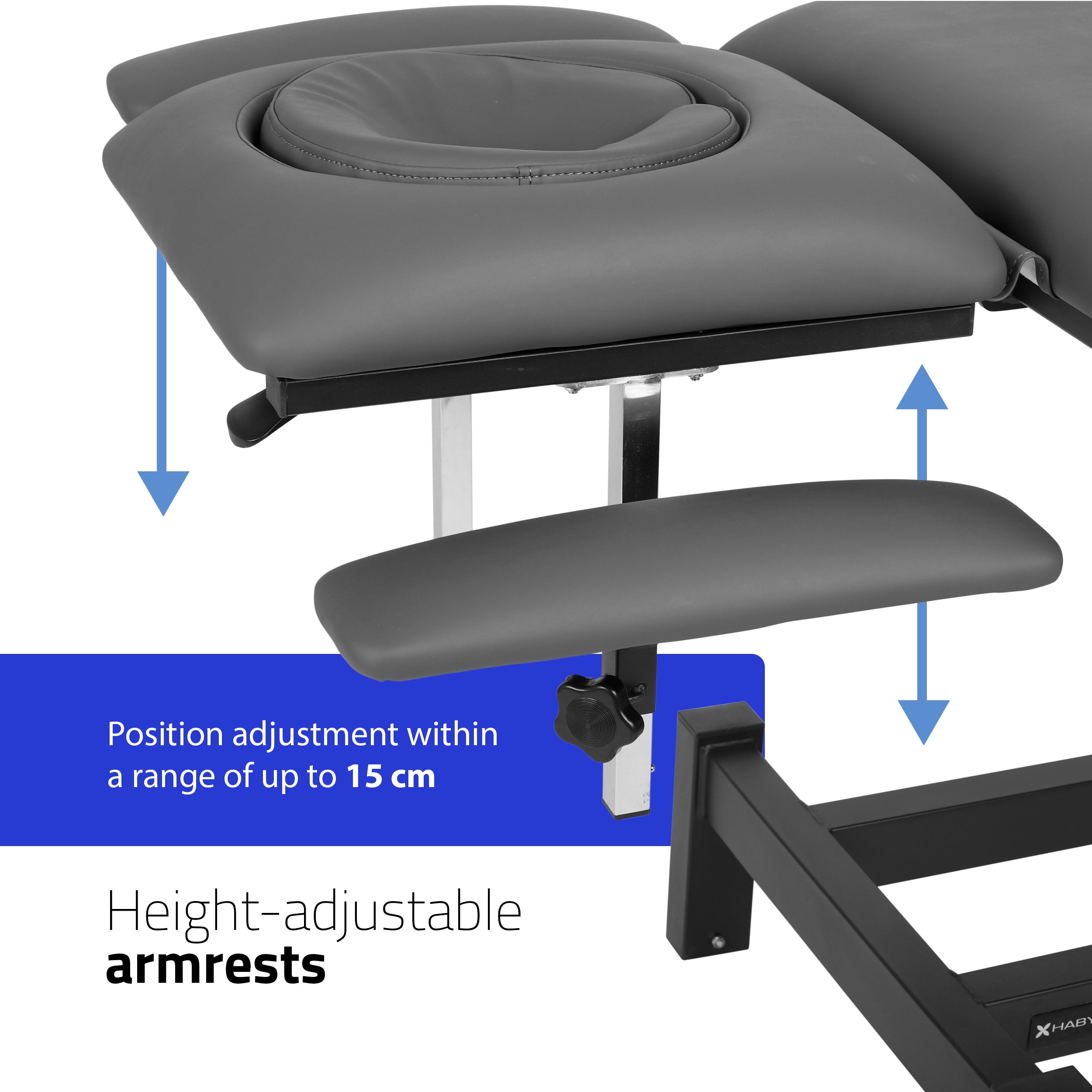 4-segment tabletop: The table top, measuring 192 cm x 68 cm, consists of 4 segments that can be easily adjusted to the individual needs of the patient. The adjustment of the headrest and armrests ensures precise adjustment of the patient's position, which is crucial during manual therapy and massage.