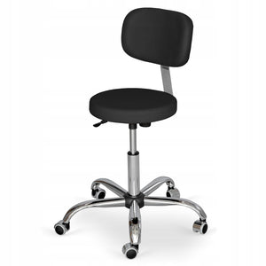 Elegant and comfortable stool with a backrest, featuring a chrome frame and durable, rubberized wheels. The solid construction and backrest guarantee full stability and comfort during use. The rubberized wheels allow for smooth movement around the patient. A gas spring regulates the seat height, and the attractively curved legs and wheel covers are chrome-plated, giving the stool a modern and attractive appearance.