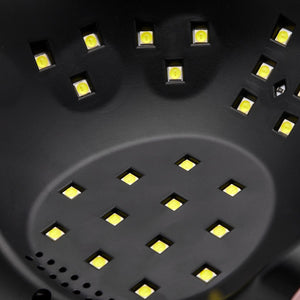 Profesionální UV/LED lampa nejnovější generace, která díky duální LED technologii rychle a rovnoměrně vytvrzuje všechny gely, hybridní laky a další přípravky vytvrzované světlem. Vyzařuje bílé světlo, které neunavuje oči. Lampa V7 má vysoce výkonný, energeticky účinný zdroj světla s duálním rozsahem vlnových délek 365 nm a 405 nm. Kromě toho obsahuje 36 diod, které poskytují celkový maximální výkon 168 W! Lampa má vestavěný snímač pohybu, časovač na 10, 30, 60 a 99 sekund a po aktivaci snímače svítí nepřetržitě až 99 sekund. 'Režim nízkého zahřívání' na 99 sekund je režim, ve kterém se výkon lampy postupně zvyšuje každých 30 sekund. Eliminuje pocit pálení při aplikaci stavebních gelů. Velký elektronický displej usnadňuje kontrolu času.