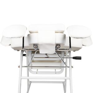 Křeslo má manuálně nastavitelnou opěrku nohou, opěradlo a opěrku rukou pro praktika. Opěrka rukou je mimořádně praktické řešení, které u jiných křesel nenajdete. Je vybaveno pohodlným polštářkem pro klientku a praktickými zásobníky pro umístění potřebného příslušenství.