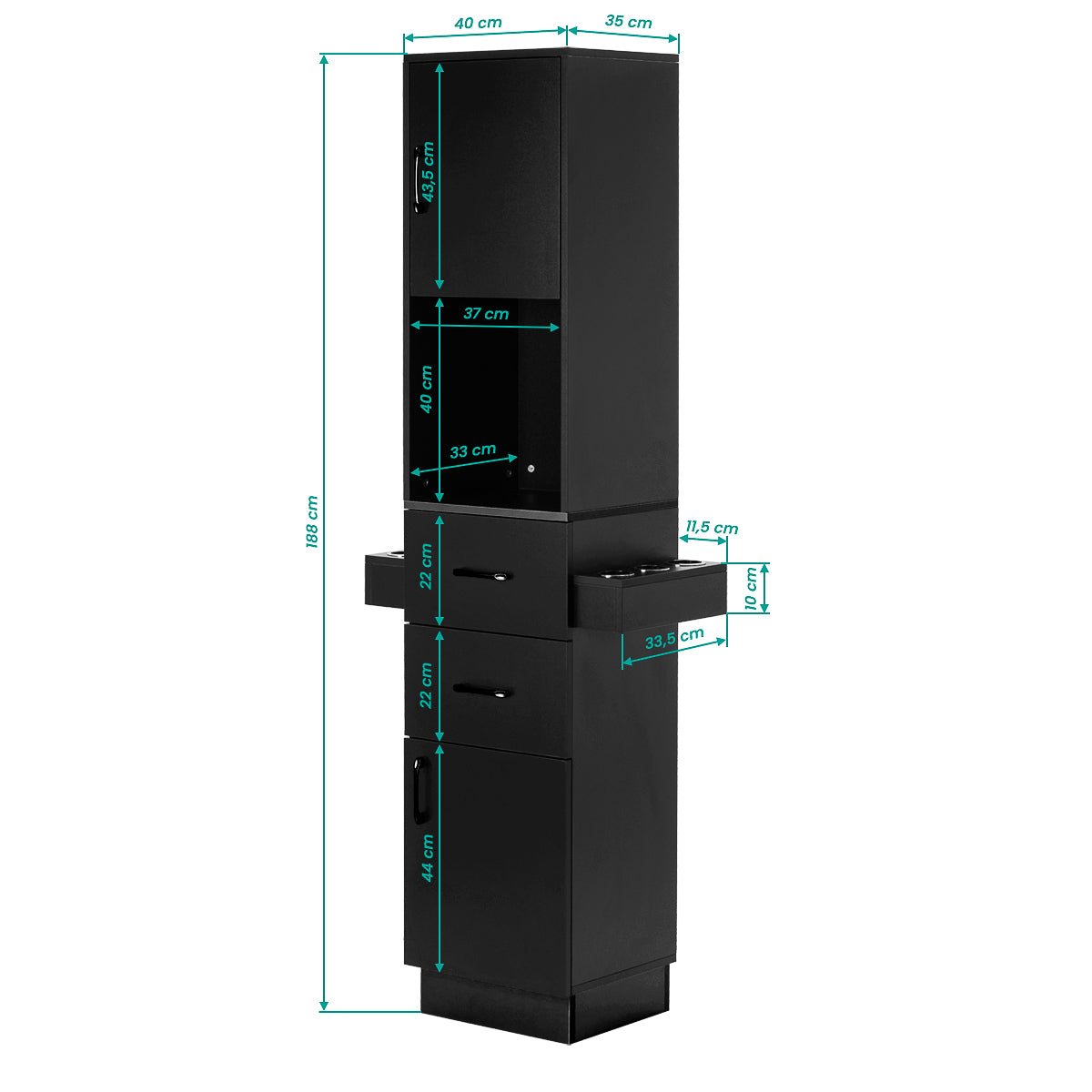 The sturdy construction ensures stability, whilst the smooth surfaces make it easy to keep the unit clean. The classic colour scheme gives the cabinet a timeless character that will fit perfectly into both minimalist and more distinctive interiors. The black handles not only emphasise the elegant design but also ensure that each cabinet and drawer opens smoothly. The whole unit is a practical solution for a hairdressing salon, where order, ergonomic working conditions and a consistent aesthetic are essential.