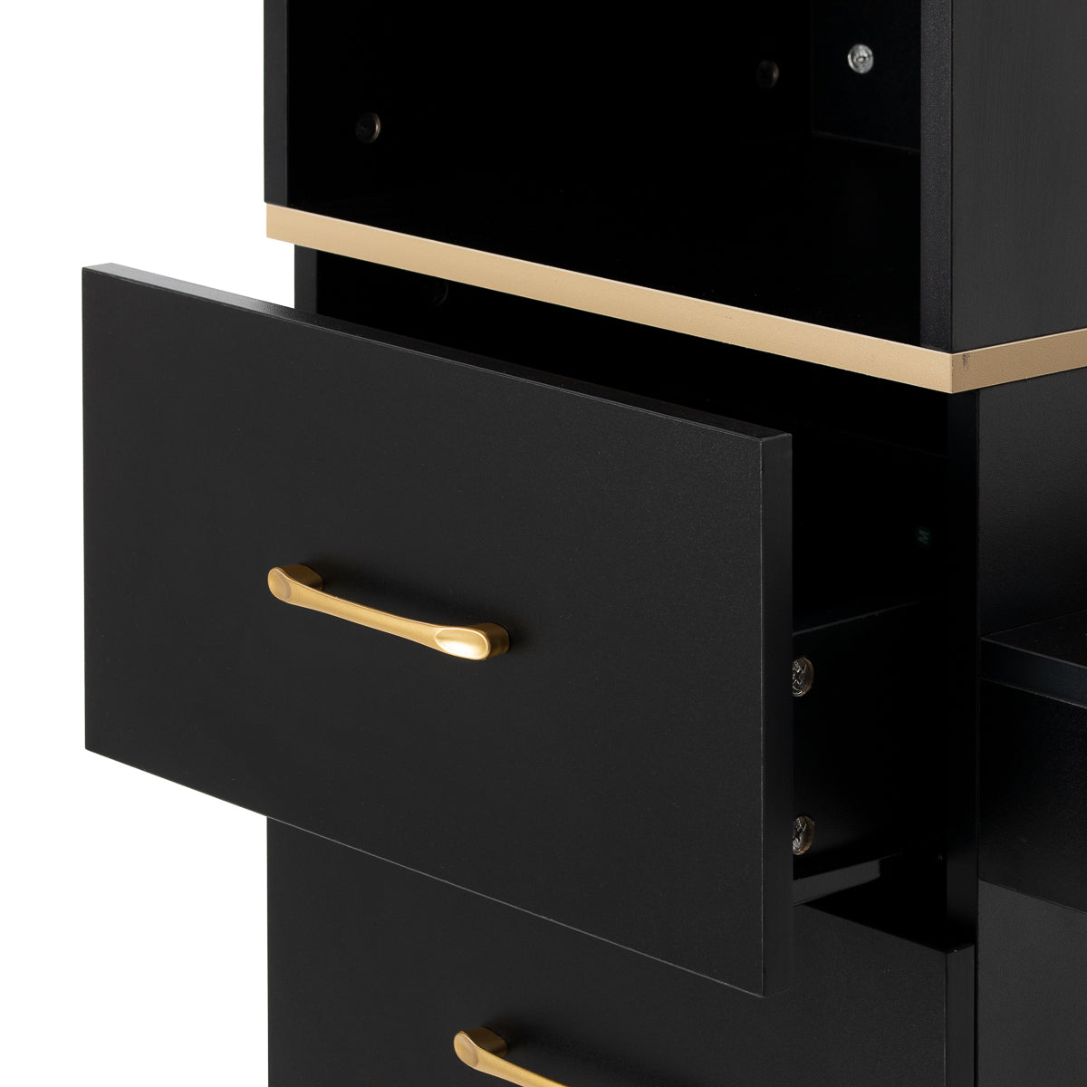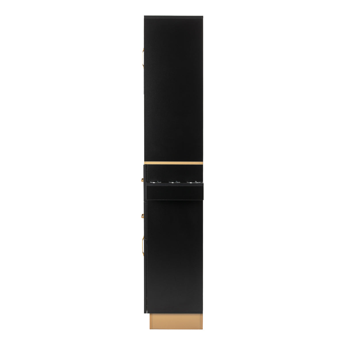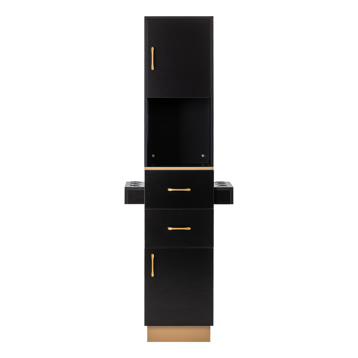 The sturdy construction ensures stability, whilst the smooth surfaces make it easy to keep the unit clean. The classic colour scheme gives the cabinet a timeless character that will fit perfectly into both minimalist and more distinctive interiors. The gold handles not only emphasise the elegant design but also ensure that each cabinet and drawer opens smoothly. The whole unit is a practical solution for a hairdressing salon, where order, ergonomic working conditions and a consistent aesthetic are essential.