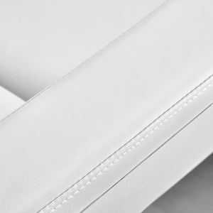 Křeslo je vyplněno pěnou odpovídající tvrdosti a potaženo na dotek příjemnou imitací kůže v bílých odstínech. Díky použití materiálu, který se snadno udržuje v čistotě a je odolný vůči vybraným dezinfekčním prostředkům, je zařízení pohodlné při používání, odolné vůči vlhkosti a nekomplikované na čištění. Robustní základna z odolného bílého materiálu zajišťuje stabilitu při ošetření. Vhodně tvarované lemy dodávají křeslu stylový vzhled a zajišťují ergonomii sedadla.