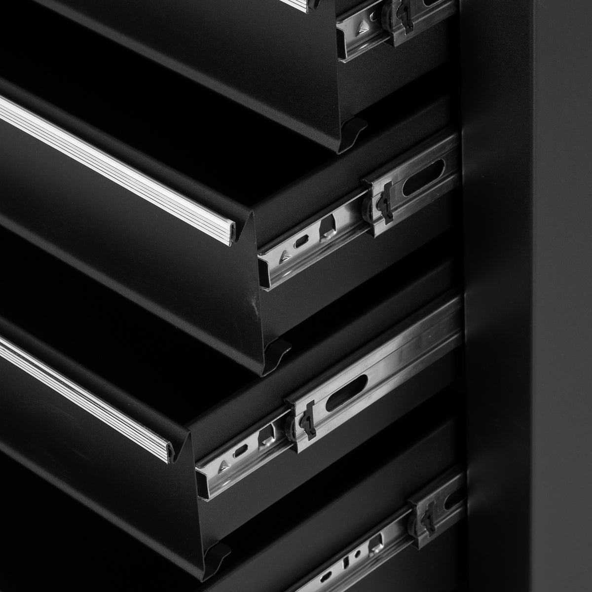 The model is equipped with five capacious drawers finished with anti-slip mats, and there is an additional shelf with an anti-slip mat on top. They provide secure storage for tools, inks and disposable accessories without the risk of shifting when opening or moving the helper, promoting tidiness and efficient organisation of work.