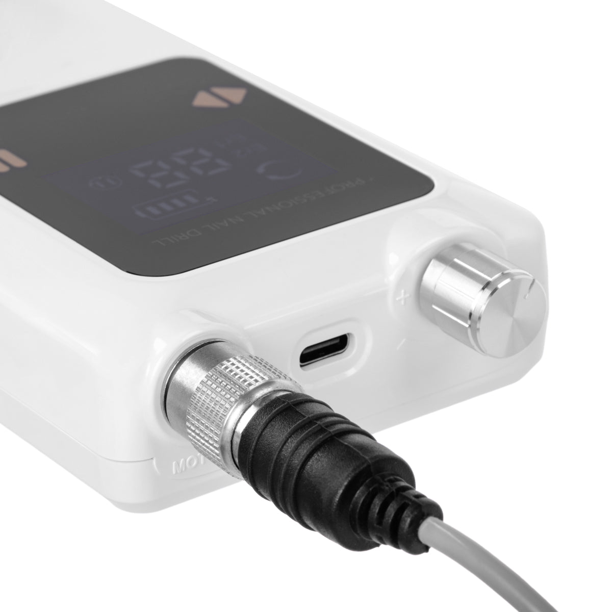 The knob allows for smooth adjustment of the head speed, reaching up to 30,000 revolutions per minute, which makes it easy to adapt to individual needs and ensures comfort during various procedures. The built-in click system informs you with a characteristic click when the knob is set correctly, protecting the motor from overload. This solution increases safety of use and contributes to the stability and durability of the nail drill during intensive, daily work.